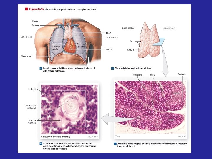 FUNZIONI del TIMO - Sede del differenziamento dei linfociti T (il midollo osseo fetale produce linfociti immaturi, i quali vanno poi a colonizzare il timo e diventano immunologicamente competenti). - I linfociti immaturi si moltiplicano nella corticale. Man mano che procede le loro maturazione* si spostano in profondità ed entrano nella midollare come cellule immunocompetenti. - Parecchi di questi linfociti lasciano poi il timo e raggiungono col sangue la milza, i linfonodi e altri tessuti linfatici) - Secrezioni di ormoni = CELLULE EPITELIALI (TIMOSINA, TIMOPOIETINA, TIMULINA E FATTORE TIMICO UMORALE) che promuovono il differenziamento delle cellule T. - *Selezione (positiva e negativa) dei timociti: self/not-self