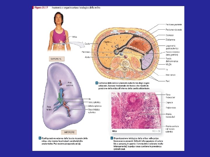 MILZA • Più grande organo linfatico (grandezza di un pugno) 12 -13 cm in altezza, 200 gr, rivestita dal peritoneo • Nel cavità addominale, ipocondrio sinistro • Consistenza soffice, colore rosso porpora • Dimensioni variabili: malattie infettive, età avanzata (malaria, anemia falciforme, mononucleosi)