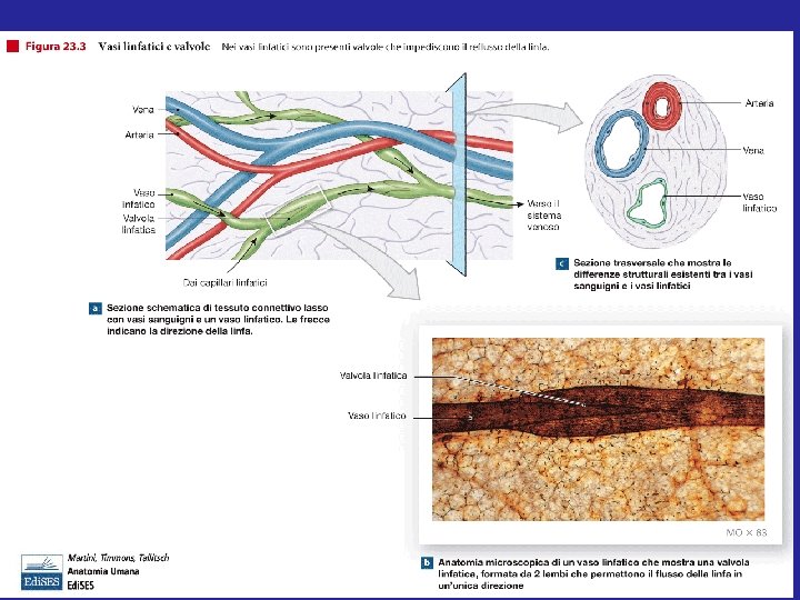 CAPILLARI LINFATICI Invaginazioni della tonaca intima, che si proietta nel lume, circondata da fasci di fibre muscolari lisce -originano come vasi a fondo cieco (capillari linfatici, vasi chiliferi nell’intestino) Presenti in quasi tutti i tessuti (eccezione di: sistema nervoso centrale, cartilagine, osso, midollo osseo, timo, denti e placenta) -Unico strato di cellule endoteliali piatte parzialmente sovrapposte (permettendo l’entrata ma non la fuoriuscita dei liquidi) -Filamenti di ancoraggio -Numerose valvole (aspetto varicoso) -Elevata permeabilità (endotelio fenestrato e m. basale discontinua)