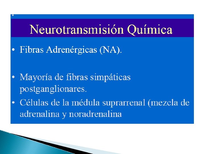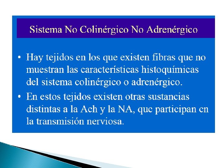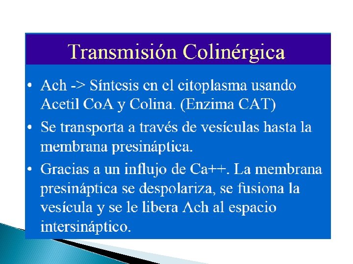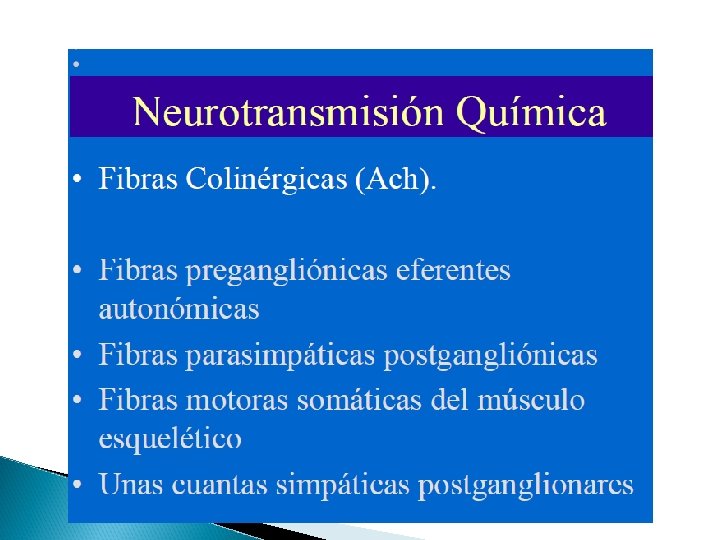 Características básicas Todas las neuronas preganglionares son fibras colinérgicas (liberan acetilcolina) Las neuronas posganglionares parasimpáticas son colinérgica La mayor parte de neuronas posganglionares simpáticas son adrenérgicas (excepto las que van a las glándulas sudoríparas y unos poco vasos sanguíneos y músculos esqueléticos son simpáticas colinérgicas)