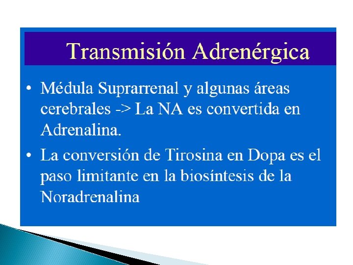 Síntesis de NA, eliminación y duración de acción 1. 2. 3. 4. 5. Tirosina hidroxilación DOPA descarboxilación Dopamina Transporte de Dopamina al interior de las vesículas Dopamina hidroxilación NA En la Médula Suprarrenal la NA se metila Adrenalina Recuperación de 50 a 80% por transporte activo vuelve a las vesículas, eliminación por difusión a liq corporales, destrucción por MAO y COMT Desaparece en la sangre (vida media 10 a 30 “) o es destruóda por la monoaminoxidasa o la catecol O metiltransfera