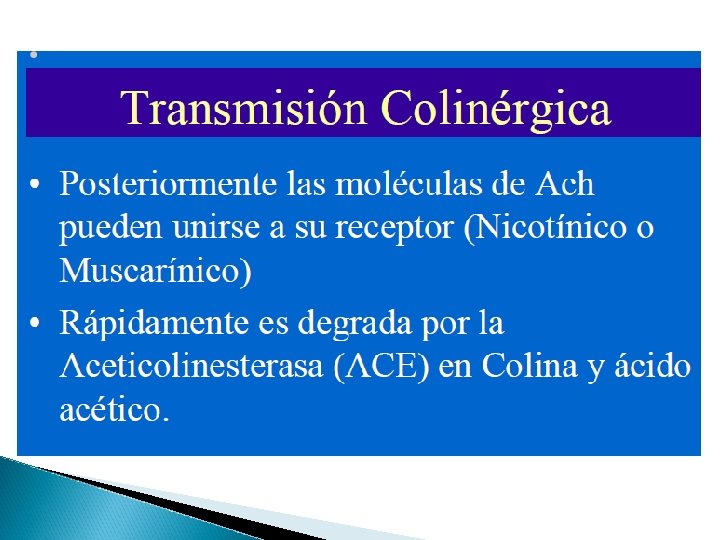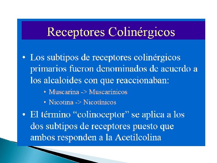 Colinorreceptores Nicotínicos -Placa motora del músculo esquelético, neuronas postganglionares. -Despolarización de la membrana celular. Muscarínicos -Órganos efectores del sistema nervioso parasimpático, corazón, tubo digestivo, bronquiolos, vejiga y órganos sexuales masculinos. -En algunos órganos efectores del sistema nervioso simpático: glándulas sudoríparas y el músculo vascular liso del músculo esquelético.