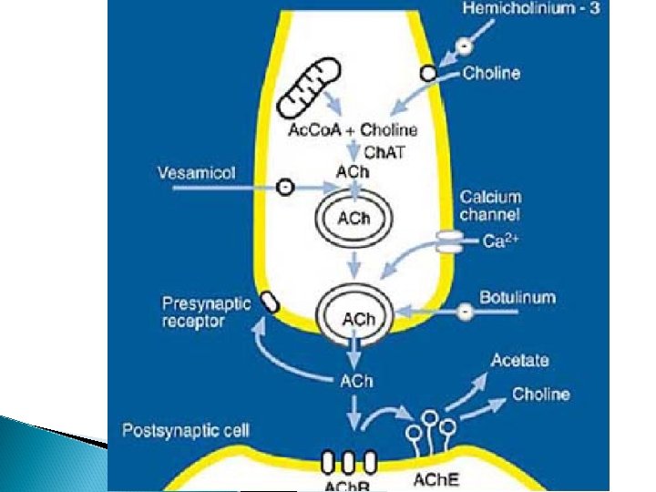 Receptores automomos Colinorreceptores o colinoceptores A Muscarinicos M 1 Localización Mecanismo de acción Neuronas SNC, neuronas pos ganglio simpática Formación de IP 3, aumento del calcio M 2 Miocardio, M Liso Apertura de canales de potasio, inhibición de la adenilciclasa M 3 Glandulas exoginas, M liso, vasos Formación de IP 3, aumento de calcio intracelular B Nicotínicos Placa Apertura de los neuromusculares de canales de sodio y musculo esquelético, potasio Neuronas pos ganglionares