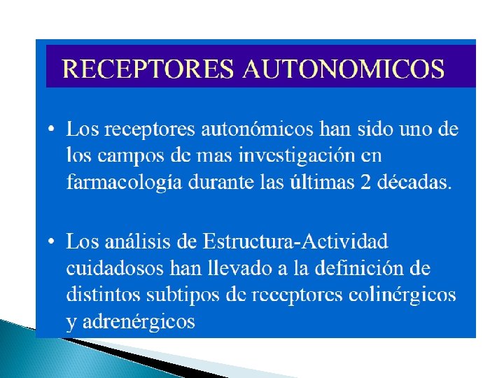 Receptores autónomos Localización -Cuerpos celulares de las neuronas postganglionares. -Órganos efectores. Tipos Adrenorreceptores. -Activados por catecolaminas. Colinorreceptores. -Activados por acetilcolina Exterior de las membranas cels, ligado a proteína trasmembrana, puede activar o inhibir a la enzima ligada a prot. receptora