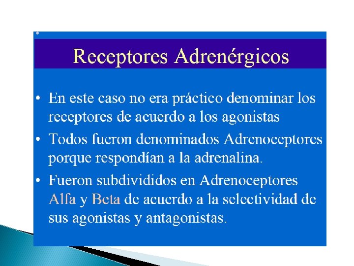 Adrenorreceptores β β 1 -Corazón, glándulas salivales, tejido adiposo y riñón. -Aumento de la frecuencia cardíaca, velocidad de conducción y contractilidad. Aumento de la secreción de saliva. Liberación de renina β 2 -Músculo liso vascular, paredes del tubo digestivo vejiga y bronquiolos. -Relajación o dilatación.