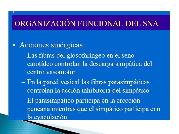 Sistema nervioso autónomo -División simpática -Ejercicio, situaciones de alarma, nerviosismo, miedo. -División parasimpática -Descanso, digestión, defecación y diuresis.