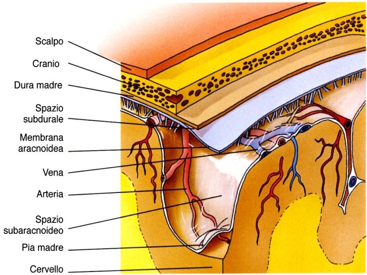 Seno sagittale superiore Cranio Periostio Dura Mater Singolo strato funzionale Spazio subdurale Aracnoide Spazio subaracnoideo Vasi Pia Madre intimo contatto col cervello Cervello Seno sagittale superiore Periostio Dura Mater Singolo strato funzionale Spazio subdurale Aracnoide Spazio subaracnoideo Pia Madre Cervello Seno sagittale inferiore