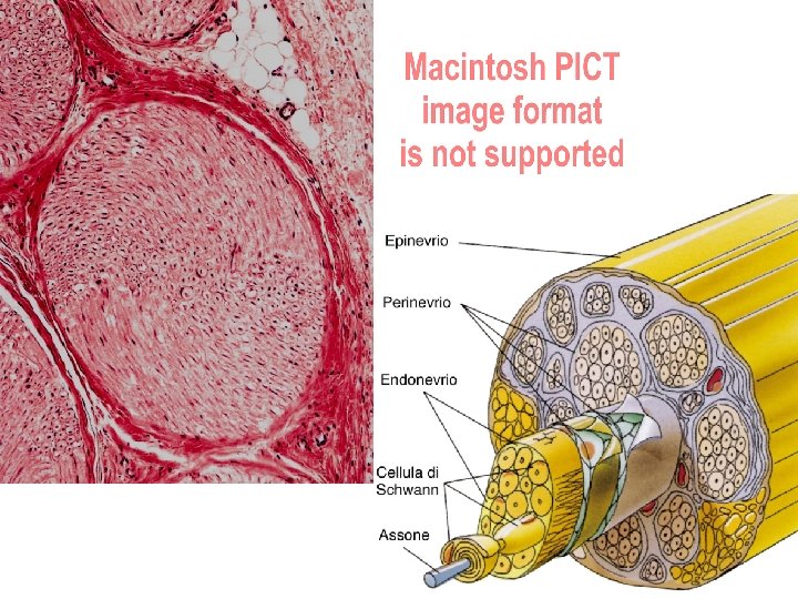 Organizzazione dei nervi Fasci di Fibre Sensitive e Motorie circondati da rivestimenti connettivali • Epinervio – Strato più esterno – Connettivo fibroso denso con fibre elastiche – Spesso all’origine, poi si assottiglia, può mancare • Perinervio – Guaina intermedia – Delimita i singoli fasci – Connettivo denso – Cellule Epitelioidi interno – Fibre collagene intersperse – Scarse fibre elastiche – Spessore si riduce fino a singolo strato • Endonervio – Strato più interno – Circonda ogni singola fibra (assone) – Tessuto connettivo lasso – Fibre reticolari – Capillari, fibroblasti, macrofagi fissi – Cellule di Schwann