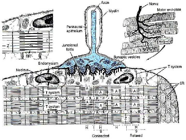 Giunzione Neuromuscolare • Terminale assonico – Membrana presinaptica – Ricoperto da Cellule di Schwann – Vescicole sinaptiche 300. 000 ripiene di Acetilcolina • Doccia o fessura sinaptica – Spazio intersinaptico • Membrana della cellula muscolare – Membrana postsinaptica – Doccia sinaptica primaria • Invaginazione della membrana dove si posiziona il teminale assonico – Fessure sinaptiche secondarie • Ulteriori modificazioni della membrana