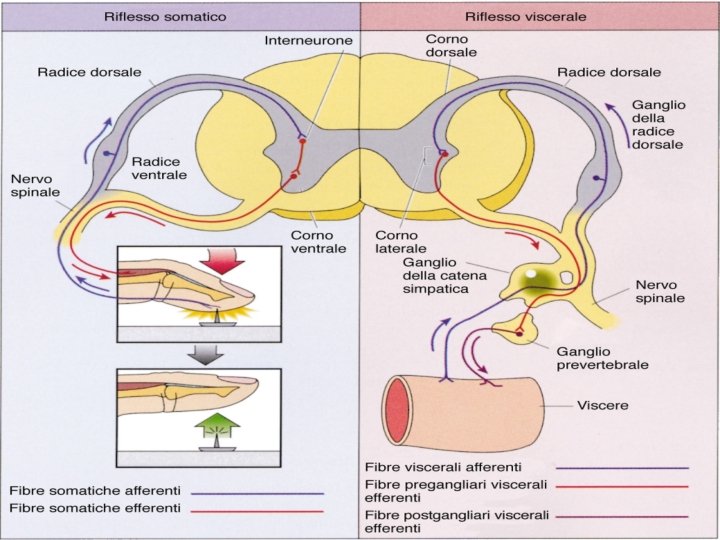 Radice dorsale del nervo spinale Ganglio della Radice dorsale Neurone sensoriale Midollo Spinale Neurone motorio Nervo spinale Midollo Spinale Recettore sensoriale Nervo spinale Radice ventrale del nervo spinale Nervo spinale Ganglio Autonomo Primo Neurone motorio Secondo Neurone motorio Tessuto effettore (muscolatura liscia) Intestino Crasso Muscolo scheletrico