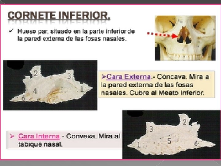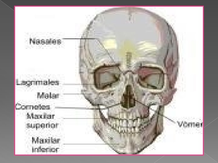 HUESOS DE LA CARA • Huesos Lacrimales: 2. • Huesos Cigomáticos: 2 • Huesos nasales: 2 • Maxilar superior : 2 • Maxilar inferior: 1 • Cornetes Inferiores: 2 • Huesos Palatinos: 2 • Hueso Vómer : 1 TOTAL : 14 HUESOS.