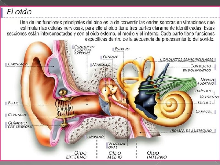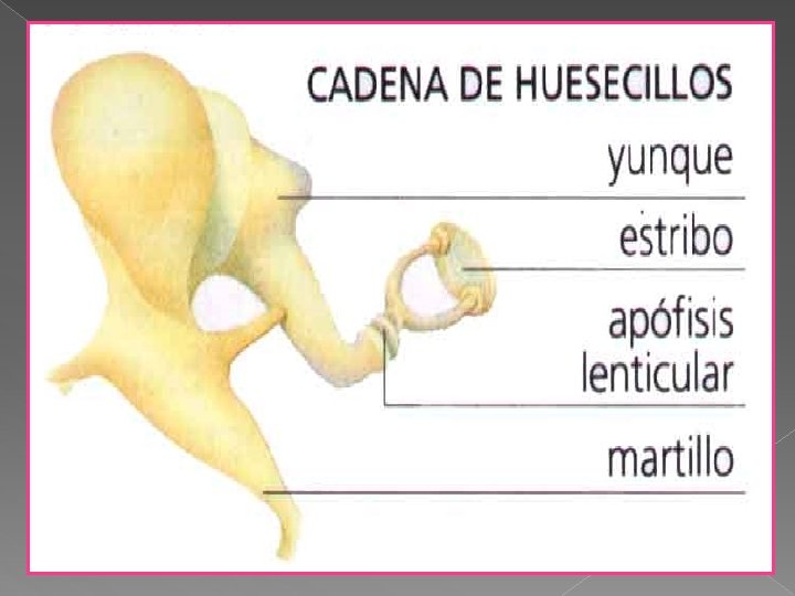 HUESOS DEL OIDO • • Yunque : 2 Martillo: 2 Estribo: 2 Lenticular : 2 (opcional) Se considera una prolongación articulada del yunque y estribo y otros consideran que es otro hueso del oído medio. TOTAL : 6 HUESOS.