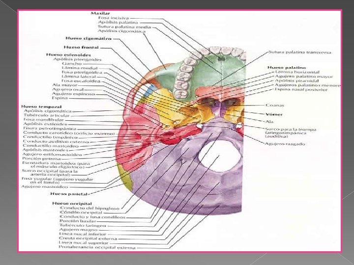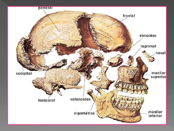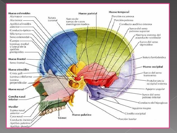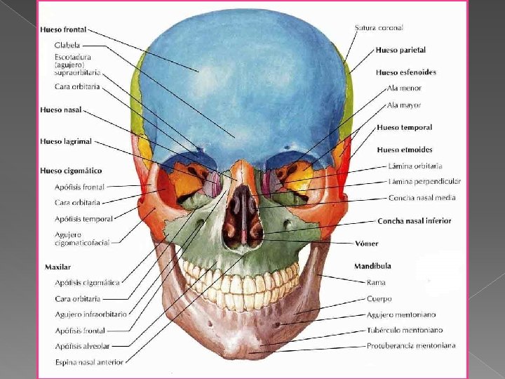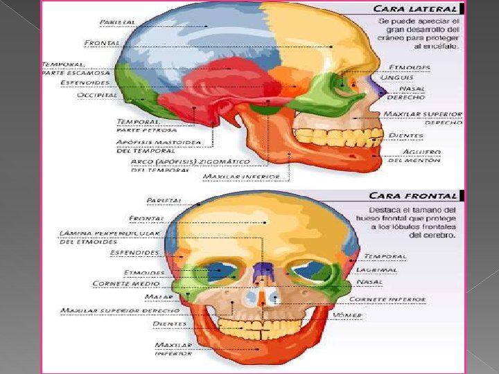 HUESOS DE LA CABEZA Cráneo: • Frontal : 1 • Parietal: 2 • temporal : 2 • Occipital : 1 • Etmoides: 1 • Esfenoides: 1 TOTAL : 8 HUESOS