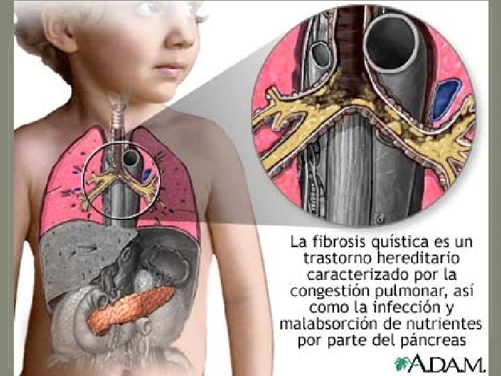 Fibrosis quística: clínica � Infecciones respiratorias recurrentes � Disfunción pancreática � Ileo-meconial en el RN, invaginaciones � Obstrucción intestinal distal � Hepatomegalia, ictericia obstructiva � Alteraciones genitales en niños (97%)