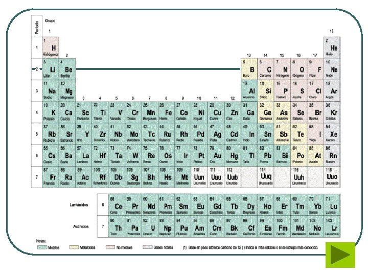 La tabla periódica. • Varios grupos de elementos tienen nombres comunes de uso frecuente. Grupo Nombre Elementos 1 A Alcalinos Li, Na, K, Rb, Cs, Fr 2 A Alcalinotérreos Be, Mg, Ca, Sr, Ba, Ra 3 A Térreos B, Al, Ga, In, Tl 4 A Carbonoidéos C, Si, Ge, Sn, Pb. 5 A Nitogenoidéos N, P, As, Sb, Bi 6 A Anfígenos O, S, Se, Te, Po 7 A Halógenos F, Cl, Br , I , At. 8 A Gases nobles He, Ne, Ar, Kr, Xe, Rn