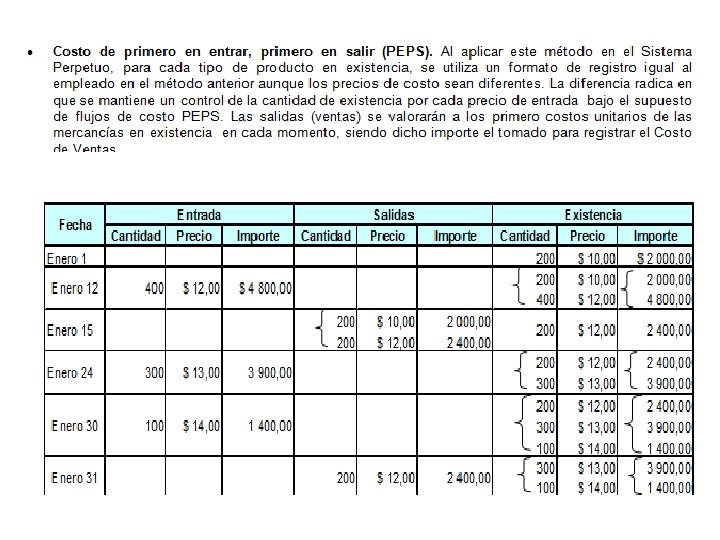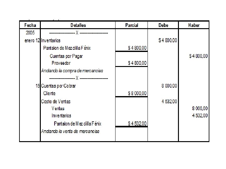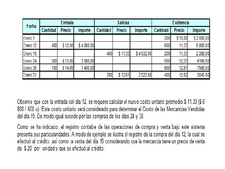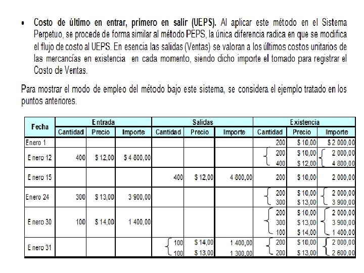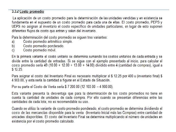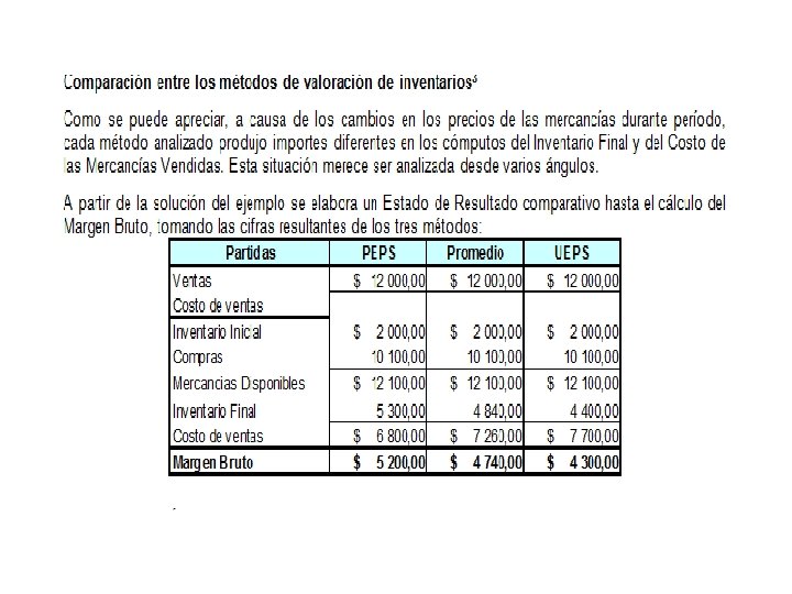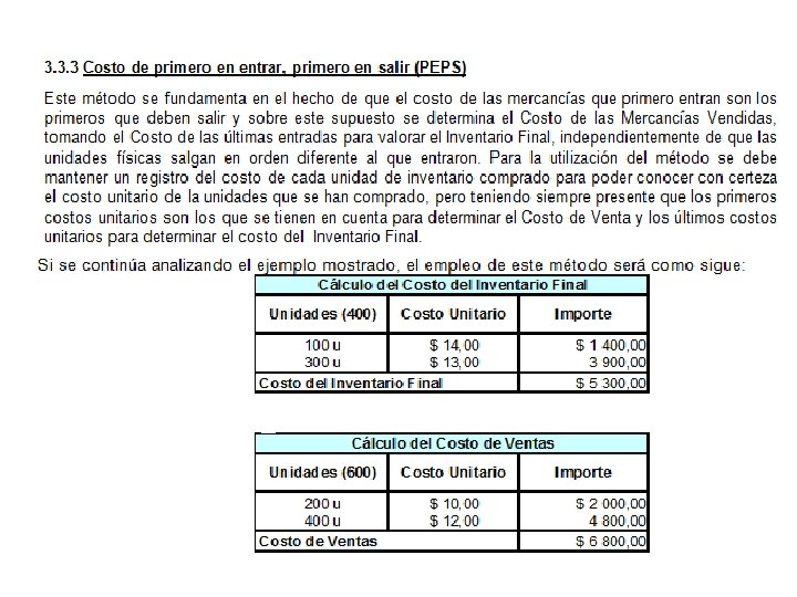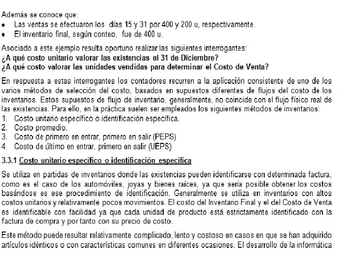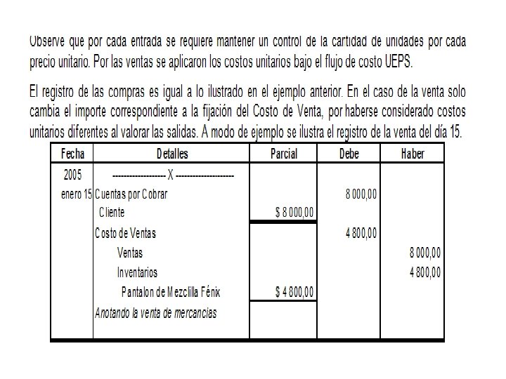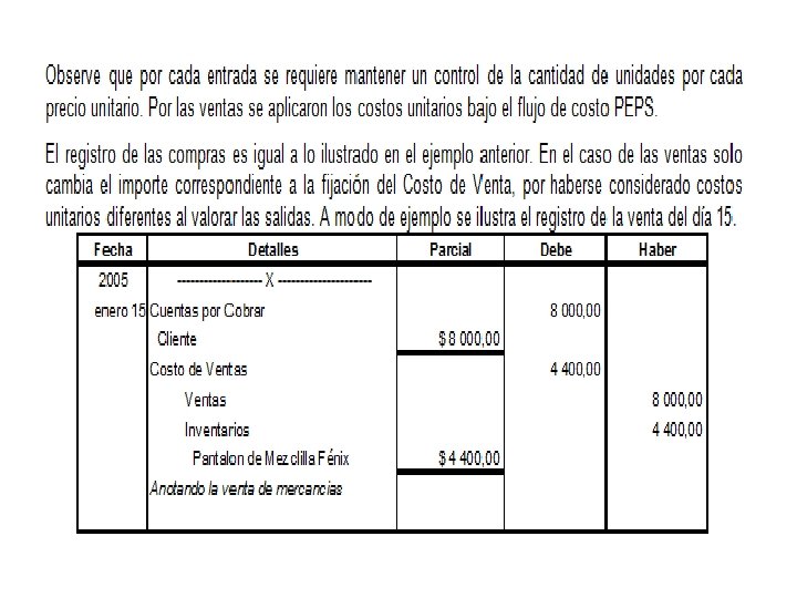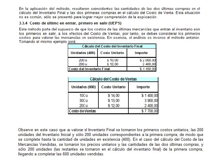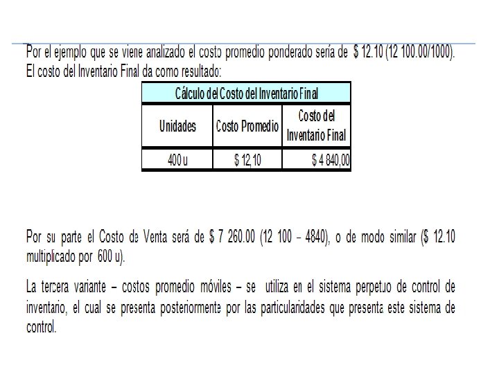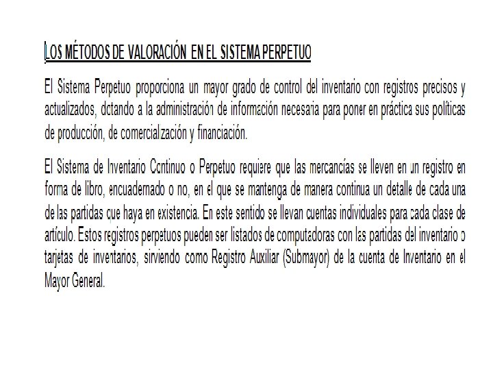 1. La cantidad de Inventario en existencia se 1. determina por conteo físico, y se aplican los costos unitarios de acuerdo con el método de valoración que se emplee para determinar el costo del Inventario Final. También pueden emplearse métodos de estimación de inventarios. La cantidad de Inventario en existencia lo brinda la cuenta de Inventario. El conteo físico se realiza para comprobar la exactitud de los registros contables. 1. El Costo de las Mercancías Vendidas se determina a partir de un cálculo, el cual fue conoce sobre una base diaria, mediante el explicado anteriormente. saldo de la cuenta Costo de Ventas.