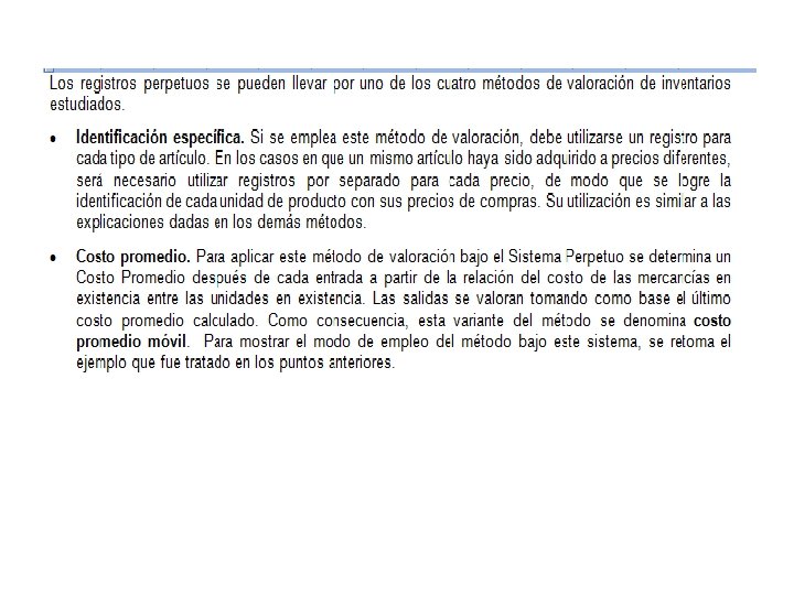 Sistema periódico Sistema perpetuo 1. Se recomienda su uso para partidas de 1. Puede ser utilizado para todo tipo de bienes. inventarios que tengan bajos costos unitarios. Este sistema proporciona un mayor grado Los artículos de bajos costos quizás no sean de control de las existencias que el Sistema lo suficientemente valiosos para merecer el Periódico. Para el control particular de cada costo de mantener un registro continuo de las una de las partidas de inventario se utiliza mercancías en existencias. una tarjeta, comúnmente conocida como Submayor de Inventarios. 1. No se lleva un registro actualizado de todos 1. Se lleva un registro actualizado de todos los bienes comprados y vendidos 1. El conteo físico de las existencias debe hacerse al menos una vez al año.