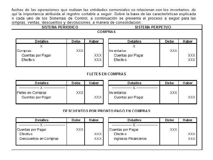 1. Las compras de mercancías se registran en la 1. Las compras de mercancías se cargan cuenta Compras. Cuenta de gastos nominal directamente a la cuenta de Inventario. donde se acumula el costo de las mercancías Los Fletes en Compras y los Gastos de compradas. Los Fletes en Compras y los Importación se incluyen en la cuenta de Gastos de Importación se contabilizan en Inventarios. cuentas separadas de la cuenta Compras para los fines de su control. 1. La cuenta de Inventario no aumenta ni 1. La cuenta de Inventario durante todo el disminuye durante todo el período, período aumenta y disminuye de acuerdo manteniendo su saldo inicial. Los movimientos con la entrada y salida de las existencias físicos de las existencias por Compras, Ventas físicas. Se afecta por las Compras, Ventas y Devoluciones no afectan el saldo de esta y Devoluciones. cuenta.