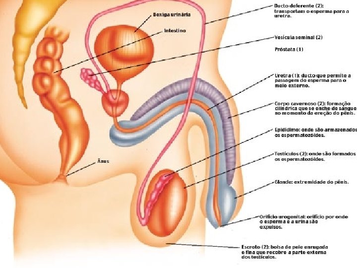 Pênis • Órgão masculino da cópula, é uma estrutura flácida, quando não estimulada. É ligado às paredes anterior e lateral do arco pubiano • É composto de três colunas longitudinais duas de corpos cavernosos e um esponjoso de tecido erétil (capaz de aumentar de tamanho quando repleto de sangue) • A estimulação sexual é parassimpática dilata as artérias que suprem o pênis e uma grande quantidade de sangue sob pressão entra nos espaços cavernosos do tecido erétil