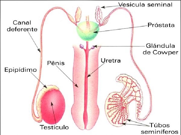 O sistema reprodutor masculino é composto por: • • Testículos Vias espermáticas Glândulas anexas Pênis