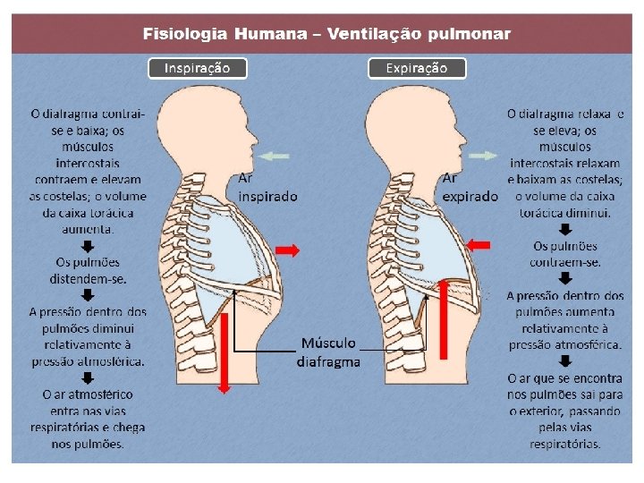 Movimentos respiratórios (Ventilação pulmonar) Como Ar entra no nosso pulmão? Os músculos intercostais e o diafragma, criam uma diferença de pressão interna o que impulsiona a entrada do ar