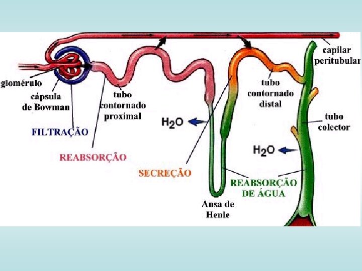 Túbulos Túbulo contorcido proximaltransporta íons com gasto de Energia. 75% do filtrado é reabsorvido neste. Absorve glicose, água, sódio, proteínas de baixo peso molecular, excreta creatinina e digere várias drogas (antibióticos, anestésicos, etc. . . ) Túbulo coletor- Absorve água Túbulo contorcido distal. Absorve água, excreta H, K Alça de Henle- absorção de sais deixando a urina isotônica, hipertônica ou hipotônica
