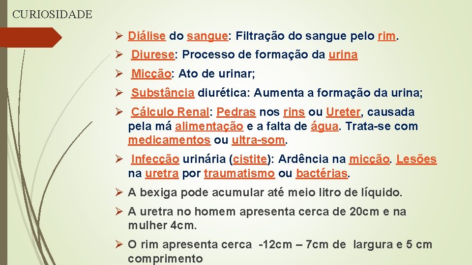 CURIOSIDADE Ø Diálise do sangue: Filtração do sangue pelo rim. Ø Diurese: Processo de formação da urina Ø Micção: Ato de urinar; Ø Substância diurética: Aumenta a formação da urina; Ø Cálculo Renal: Pedras nos rins ou Ureter, causada pela má alimentação e a falta de água. Trata-se com medicamentos ou ultra-som. Ø Infecção urinária (cistite): Ardência na micção. Lesões na uretra por traumatismo ou bactérias. Ø A bexiga pode acumular até meio litro de líquido. Ø A uretra no homem apresenta cerca de 20 cm e na mulher 4 cm. Ø O rim apresenta cerca -12 cm – 7 cm de largura e 5 cm comprimento