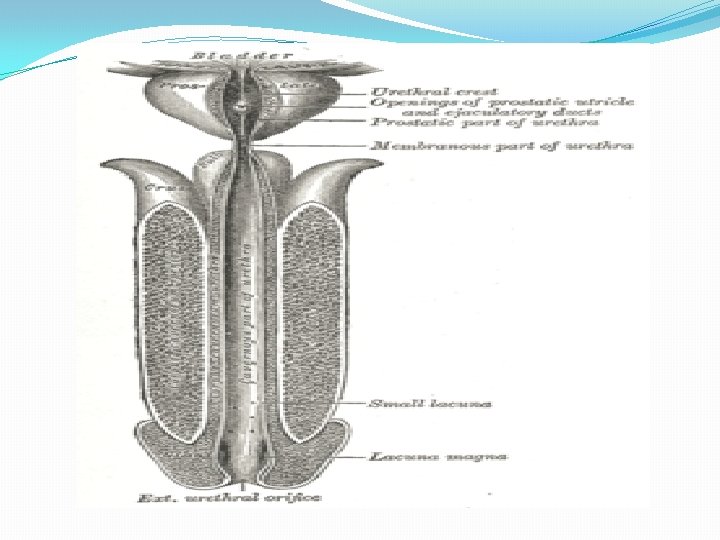 v. URETRA: • Conducto por el que pasa la orina en la fase final en el proceso urinario, desde la vejiga hacia el exterior del cuerpo durante la micción. • Su función es excretora en ambos sexos, pero en los hombres también cumple una función reproductiva. • En el hombre la uretra permite el paso del semen desde las vesículas seminales que aborcan a la próstata hasta el exterior; y mide de unos 18 a 22 cm.