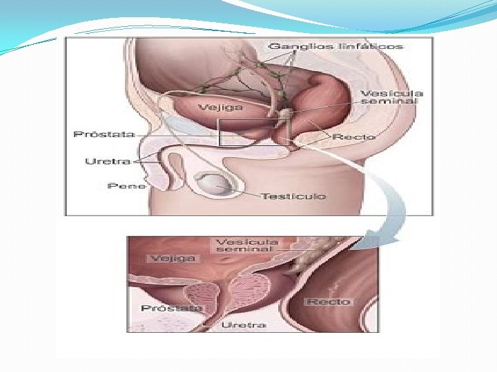 v. Conducto Eyaculador: - Comienza al final de cada vaso o conducto deferente y termina en la uretra. - En la eyaculación, el semen pasa a través de estos conductos y es posteriormente expulsado a través de la uretra. v. Próstata: - Órgano glandular, con forma de castaña, localizada frente al recto, debajo y a la salida de la vejiga urinaria. - Contiene células que producen parte del liquido seminal que protege y nutre a los espermatozoides contenidos en el semen.