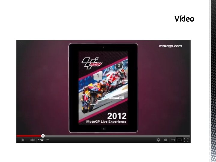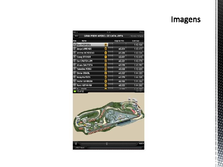 § Informações: § Informações dos eventos e resultados e ainda informação sobre cada circuito. § Notícias, Fotos e Vídeos: § Notícias durante os eventos e entre as corridas com o feed de noticias do motogp. com e ainda visualizar uma seleção de fotos e vídeos de cada Grande Prémio. Da a possibilidade também de vídeo On. Board de uma volta a cada circuito. § Comentários Áudio em Direto: § Comentários e áudio em direto da equipa de comentadores do motogp. com.