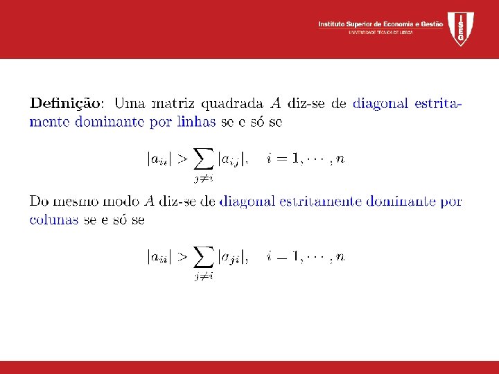 Condições suficientes de convergência Pensando nas duas normas matriciais que estudámos, elas serão inferiores a 1 para a matriz C se o módulo de cada elemento na diagonal de A for estritamente superior a todos os elementos na mesma linha ( no caso da norma infinito) ou na mesma coluna (no caso da norma 1). De facto, Este facto motiva a definição seguinte: