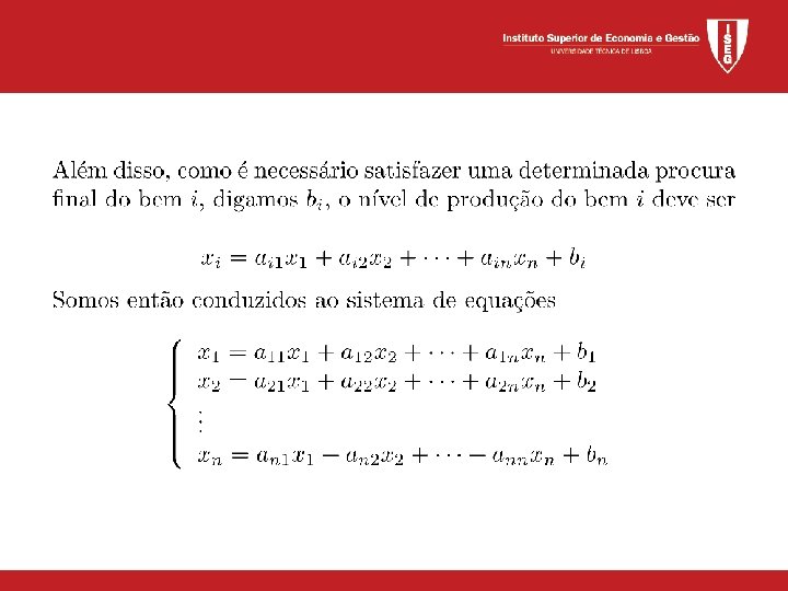 Exemplo: Modelos de Leontief • Modelos lineares que descrevem uma economia com n indústrias produtivas interdependentes, cada uma delas produzindo um bem. • Para produzir esses bens, cada uma das indústrias necessita dos bens produzidos pelas outras indústrias. • Cada indústria, além de produzir o necessário para abastecer as restantes, deve ainda satisfazer uma determinada procura final do bem. • Os dados vêm normalmente agregados por ramo de actividade, com diversos níveis de agregação, a seleccionar conforme a aplicação. • Os dados podem ser expressos em unidades produzidas ou em unidades monetárias, consoante a informação disponível.