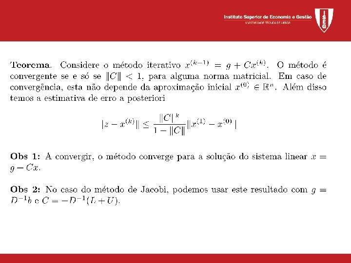 Método de Jacobi O Processo descrito anteriormente conduz a um método conhecido como Método de Jacobi, que pode ser descrito pelo seguinte algoritmo