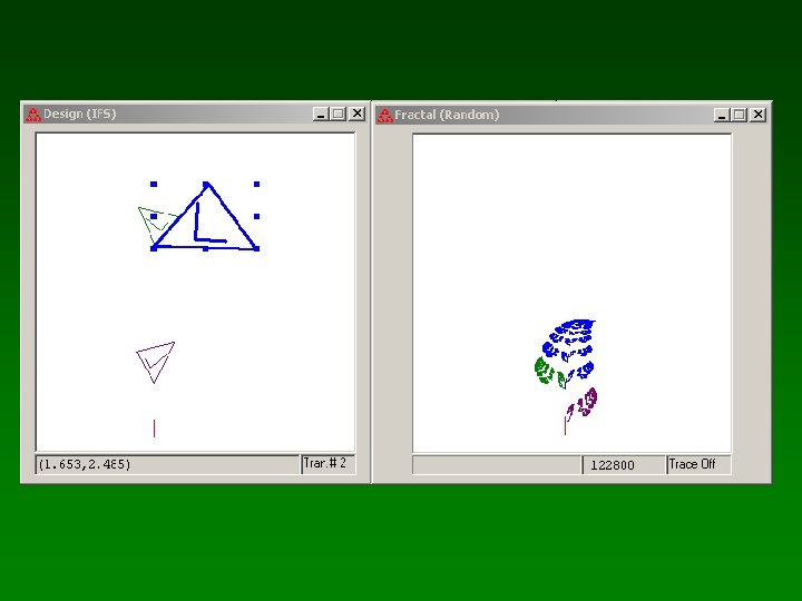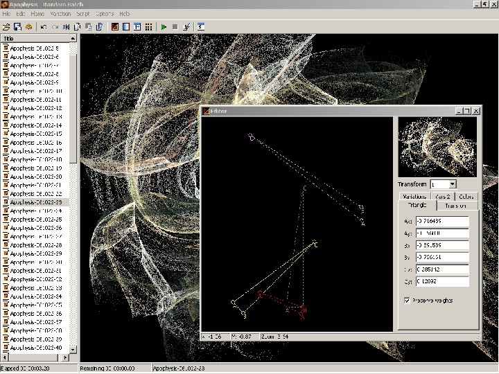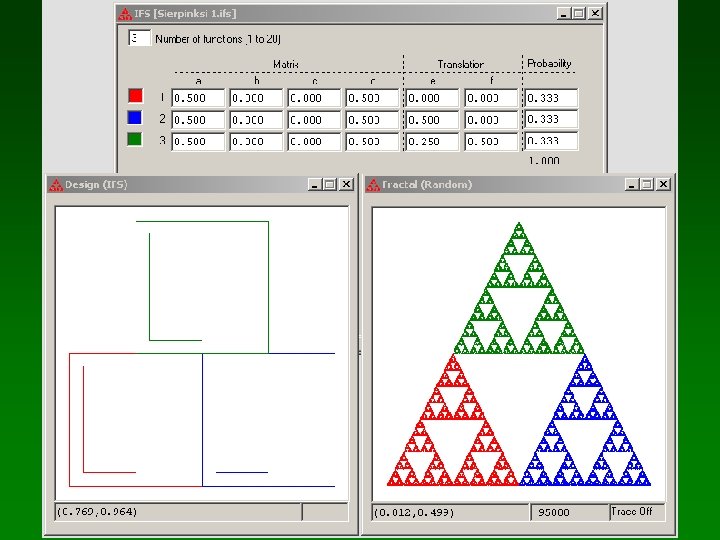 IFS Construction Kit • Todavía está en desarrollo. • Es la elección para trabajar con pleno control analítico. • Matrices y vectores, con actualización cruzada (aunque no rendering en tiempo real). • Formato de archivo compatible con Vision of Chaos, Fractint, Chaos Pro, etc.
