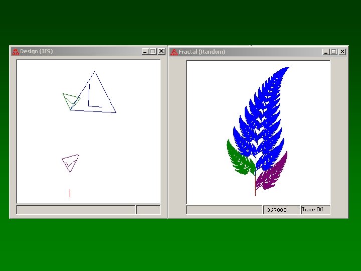 Programas para trabajar con IFS Brazil • Brazil – Viejo, pero simple y práctico. Discontinuado. – No permite operar con matrices – Morphing. • IFS Fractal Designer IFSDesign – Discontinuado e incompatible, pero excelente. – IFS puro en 2 D con actualización de imagen en tiempo real. – Puramente analógico. No tiene editor de matrices. • Apophysis – Para diseño artístico, con componente de azar. – Editor de matrices en 3 D. Flame fractals