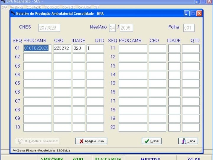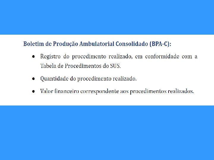 SIA/SUS – Sistema de Informação Ambulatorial do SUS - evolução Fonte de dados: BPA – Boletim de Produção Ambulatorial Ø Nos primeiros anos de funcionamento do SIA, o BPA era o único instrumento de registro que foi a transposição do formulário em papel BSP para meio magnético de registro. Ø Identificava somente a quantidade de procedimentos realizado em cada instituição. Não continha informações dos indivíduos atendidos.