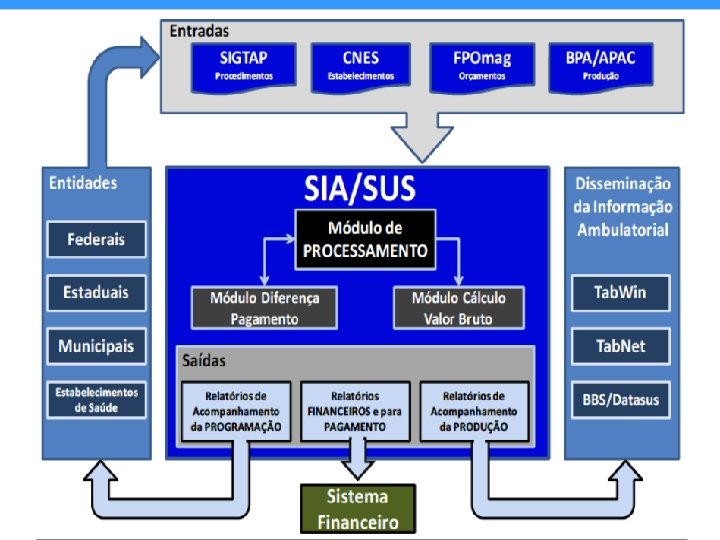 SIA/SUS – Sistema de Informação Ambulatorial do SUS - evolução 1. Acompanhamento das programações físico orçamentárias; 2. Acompanhamento das ações de saúde produzidas; 3. A agilização do pagamento e controle orçamentário e financeiro; 4. A formação de banco de dados para contribuir com a construção do SUS