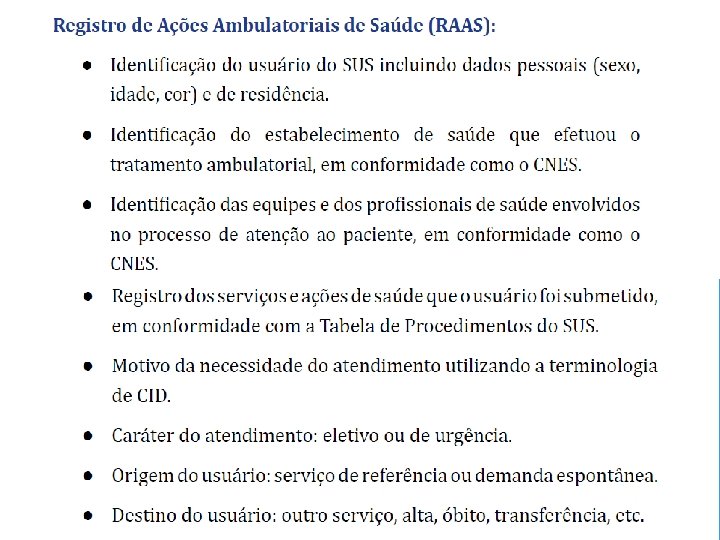 SIA/SUS – Sistema de Informação Ambulatorial do SUS - evolução Fonte de dados: RAAS – Registro das Ações Ambulatoriais de Saúde Ø Foi instituído em 2012 com o objetivo de incluir as necessidades relacionadas ao monitoramento das ações e serviços de saúde das Redes de Atenção a Saúde. Ø São registradas ações da Atenção Domiciliar (RAAS-AD) e Psicossocial (RAAS-PSI) Ø O registro não gera valor financeiro para pagamento, pois o repasse é por meio de incentivo