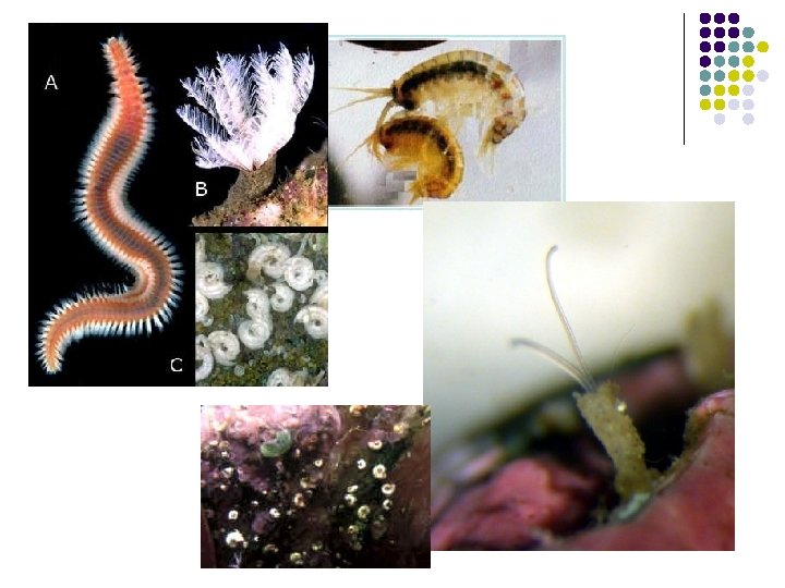 Os menos tradicionais l l l Na meiofauna encontramos quase todos os grupos animais. A morfologia dos organismos muda: são vermiformes; Em alguns casos, encontrados em densidades de até 300 ind/cm²