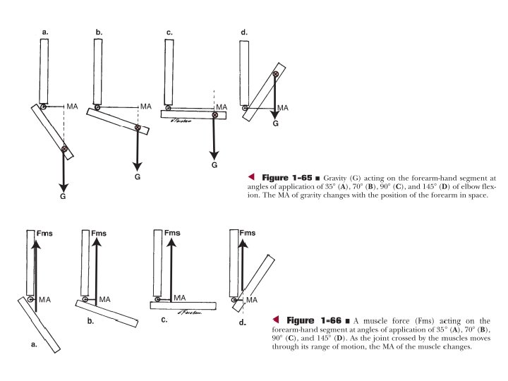CLASES DE PALANCAS EN EL CUERPO HUMANO • Las articulaciones del cuerpo humano son predominantemente palancas de tercera clase, con algunas palancas de primera clase y muy pocas con sistema de palanca de segunda clase.