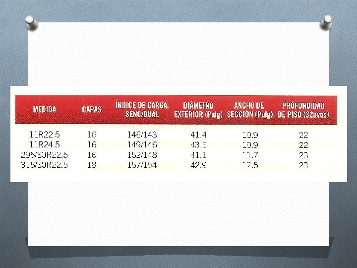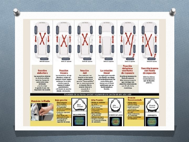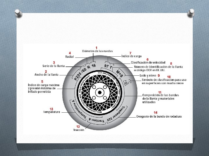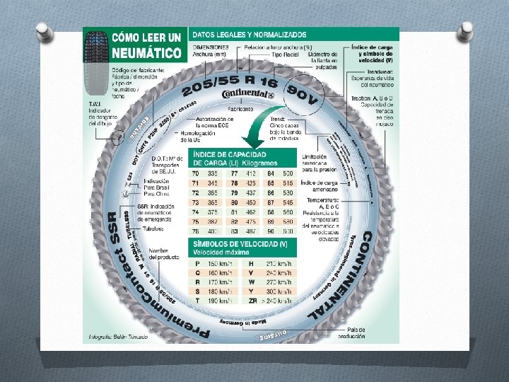 Mantenimiento e inspección de ruedas O Las ruedas se deben inspeccionar periódicamente en busca de daños por roturas, deformaciones, cuarteaduras, desgastes. O La presión de inflado es muy importante para la vida útil del neumático así como para la estabilidad y el ahorro de combustible. O El balanceo y alineamiento permiten alargar su vida útil y una conducción segura.