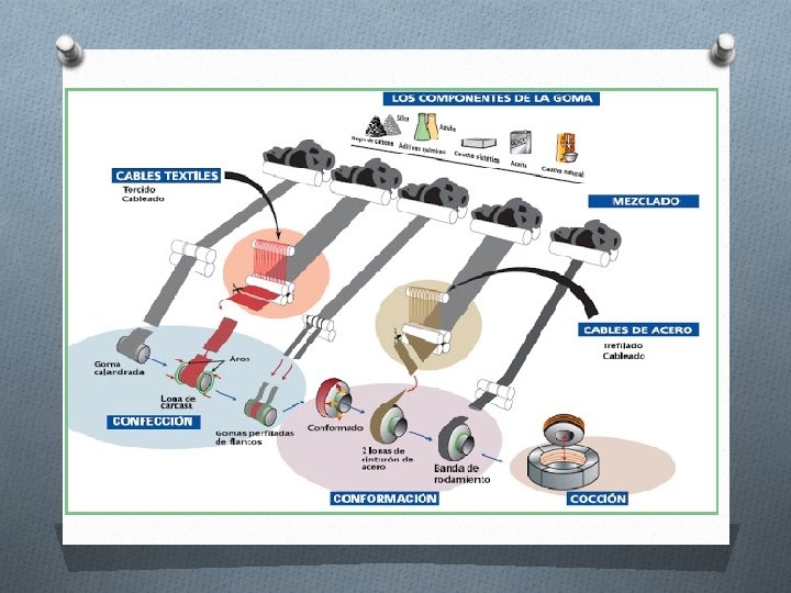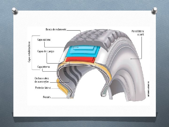 Ruedas y neumáticos O Estos elementos se comparten entre el sistema de dirección y la suspensión. O El compuesto que forma el neumático y el cojín de aire que lo hincha permite absorber la irregularidades del terreno y transmitir los esfuerzos de la suspensión, dirección y frenado. O Su composición es de caucho sintético mezclado con caucho natural, azufre, negro de humo, entre otros.