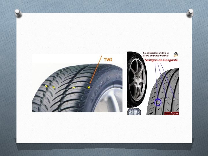 Neumáticos O Los neumáticos tienen una vida útil limitada por el desgaste, las marcas TWI que indican el límite de seguridad es de 1, 5 mm del fondo del dibujo al ras de la banda de rodadura, aquí se sugiere el cambio. O Los flancos son débiles a soportar golpes como cunetazos o baches colosales. O La banda de rodadura con su diseño de dibujo permite buen agarre en terrenos sueltos y desplazar el agua en climas lluviosos, aunque no se garantiza sobre velocidades superiores a 90 Km/hr.