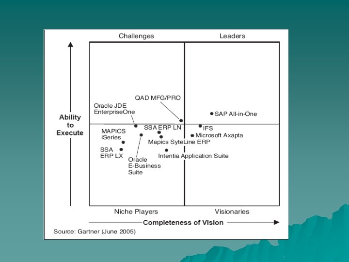 Fabricantes de ERP´s u BAAN – Esta empresa fue fundada en el año 1978 por Jan Baan, de ahí su nombre. – Su sede central está en Barneveld, Holanda y posee otra sede en Buenos Aires, Argentina. u PEOPLESOFT – Esta empresa con sede central en Pleasanton, California fue fundada en los años ochenta, 1987 por Dave Duffield y Ken Morris. – suministra software para la planificación de recursos de cualquier empresa (ERP), gestión de recursos humanos y de relaciones con los clientes (CRM).