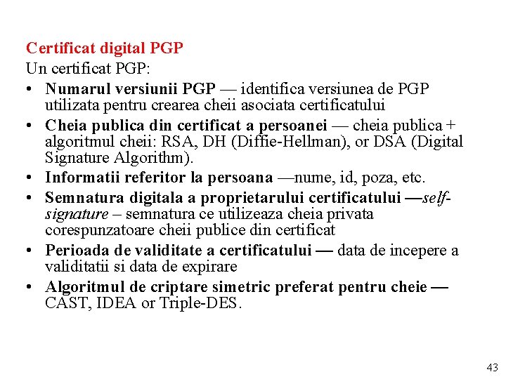 Certificat digital PGP Un certificat PGP: • Numarul versiunii PGP — identifica versiunea de PGP utilizata pentru crearea cheii asociata certificatului • Cheia publica din certificat a persoanei — cheia publica + algoritmul cheii: RSA, DH (Diffie-Hellman), or DSA (Digital Signature Algorithm). • Informatii referitor la persoana —nume, id, poza, etc. • Semnatura digitala a proprietarului certificatului —selfsignature – semnatura ce utilizeaza cheia privata corespunzatoare cheii publice din certificat • Perioada de validitate a certificatului — data de incepere a validitatii si data de expirare • Algoritmul de criptare simetric preferat pentru cheie — CAST, IDEA or Triple-DES. 43