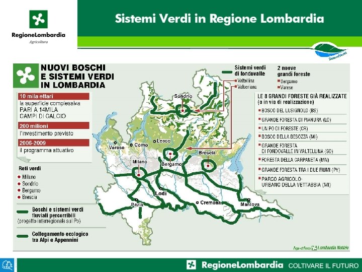 QUANTO E’ STATO INVESTITO FINO AD OGGI INIZIATIVA SUPERFICIE ha IMPORTI € 10 Grandi foreste di pianura 400 18. 977. 983, 00 Sistemi verdi Valtellina 100 3. 200. 000, 00 Misura h (2. 8) 3250 9. 500. 000, 00 Sistemi verdi 2006 315 4. 809. 224, 00 Sistemi verdi 2007 342 4. 749. 431, 65 Sistemi verdi 2008 343 4. 770. 013, 38 Totale 4750 46. 006. 652, 03