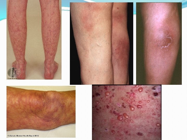 Spesifik Olmayan Lezyonlar Ø Başlıcaları pannikülit ve vasküler lezyonlardır. Diğer cilt bulguları Ø Telenjiektazi, Ø Raynoud fenomeni, Ø Tırnak çevresinde (periungual) ödem, kızarıklık Ø Vaskülite bağlı livedo retikularis, Ø Palpabl purpura, ürtiker, uçlarda hemoraji, ülser ve gangren gibi vaskülitik cilt lezyonları görülebilir. Ø Büllöz lezyonlar nadir görülür.