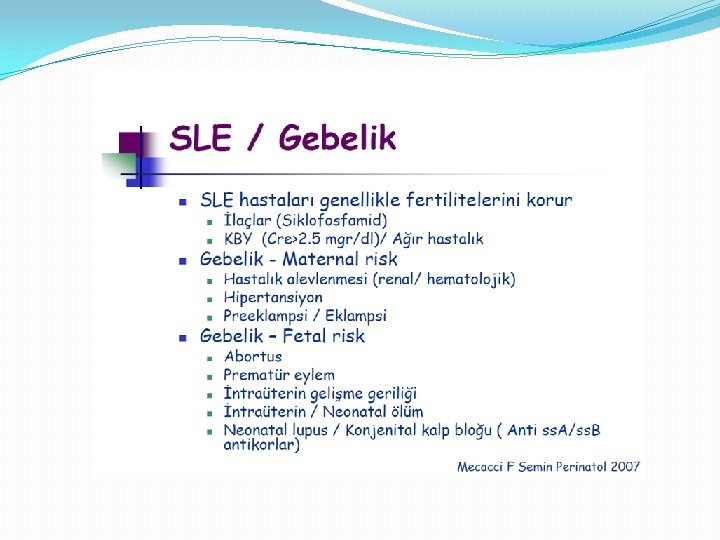 Tedavi � Erken fetal kayıpları ve antifosfolipid antikor pozitifliği olan gebelerde düşük doz aspirin (100 mg/gün) ve düşük molekül ağırlıklı heparin verilmesi önerilmektedir. �Antifosfolipid antikorları pozitif olan ve tromboz öyküsü olan SLE’li hastalarda INR 2 -3 olacak şekilde antikoagulasyon (oral warfarin tedavisi gibi)