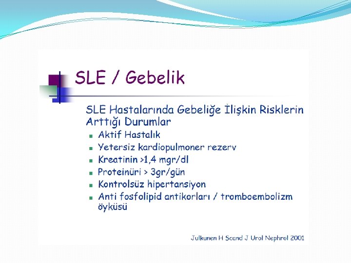 Çevresel faktörler-Nütrisyonel faktörler ve sosyoekonomik durum �Antioksidan ve vitamin D düzeylerinde düşüklük Ø Aktif inflamasyon, Ø Steroid kullanımı, Ø Yetersiz alım, güneşten korunma ve güneş koruyucu kullanımına bağlı olabilir �Kimyasal gıda ve katkı malzemeleri ile yonca filizi içindeki tartrazine ve L-canavanine hastalık riskini arttırdığı gösterilmiştir. �Düşük sosyoekonomik durum ( yoksulluk, eğitimsizlik, tıbbi bakıma uyumsuzluk, sosyal destek eksikliği gibi risk faktörleri) hastalık insidansı, şiddeti ve mortalite ilişkili bulunmuştur.