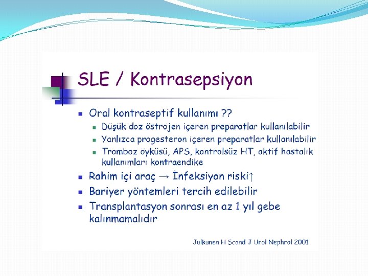 Antimalaryal ilaçlar � SLE’li hastalarda hidroksiklorokin kesildiği zaman daha sık (2. 5 kat), erken dönemde ve şiddetli (nefrit ve vaskülit) hastalık alevlenmesi olduğu (6. 5 kat fazla), ilaca devam eden grupta ise major alevlenme sıklığının % 57 daha az görüldüğü saptanmıştır. � Bu nedenle, remisyon sağlandıktan sonra hidroksiklorokine devam edilmesi önerilir. Ancak, idame dozunun belirlenmesine ihtiyaç vardır. Hidroksiklorokin tedavisi ile lupus nefritinin seyrinin ve sağkalımın daha iyi ve hasarın daha az olduğu; tromboembolik komplikasyonların ve kardiyovasküler riskin de azaldığı gösterilmiştir. Fessler BJ et al. Arthritis Rheum 2005; 52: 1473 -1480